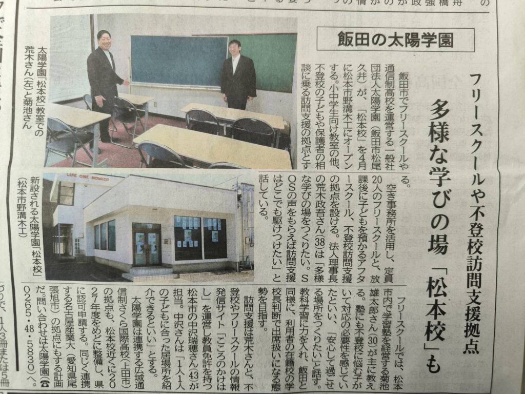 1/22(木)付の信濃毎日新聞に太陽学園松本校オープンの記事が掲載されました📰