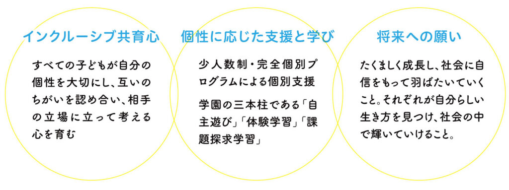 そういった障がいの有無に関係ない『インクルーシブ・共育心』の理念を実践することにより、自分の個性を大事にする気持ちを育て、それぞれのちがいを認め、相手の立場に立って考え、自分と他者を共に大切にする経験と視野を広げることができます。