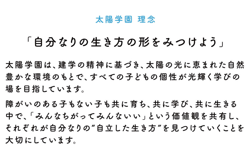 太陽学園は建学の精神に基づいて、太陽の光に恵まれた自然豊かな環境のもと、全ての子どもの個性が光輝き、障がいのある子もない子も共に育ち、共に学び、共に生き、将来における自分なりの自立した生き方の形を見つけるため、子どもたちの持って生まれた個性を尊重すべく「みんなちがってみんないい」の価値観を共有していきます。