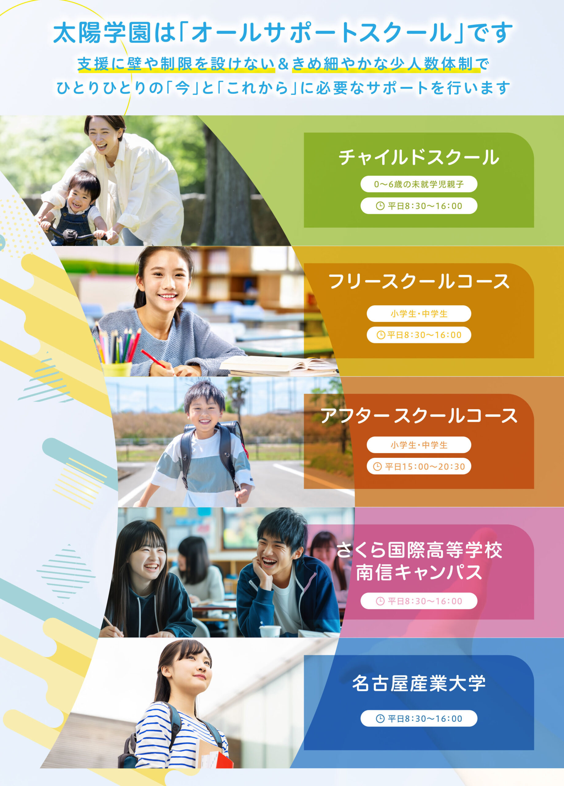 太陽学園では不登校傾向や発達障がいの子どもたちの選択肢のひとつとしてのフリースクール事業や、不登校や障がいの有無に関わらず通うことのできるアフタースクールの事業、通える通信制高等学校のさくら国際高等学校南信キャンパスを運営をしていく「オールサポートスクール」の体制を取っています。