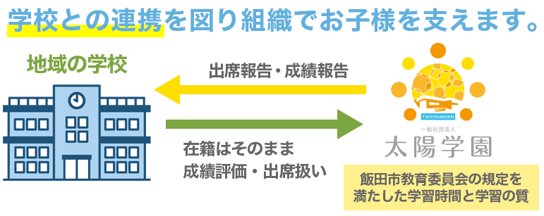太陽学園では不登校傾向や発達障がいの子どもたちの選択肢のひとつとしてのフリースクール事業や、不登校や障がいの有無に関わらず通うことのできるアフタースクールの事業、通える通信制高等学校のさくら国際高等学校南信キャンパスを運営、名古屋産業大学との連携を行う「オールサポートスクール」の体制を取っています。